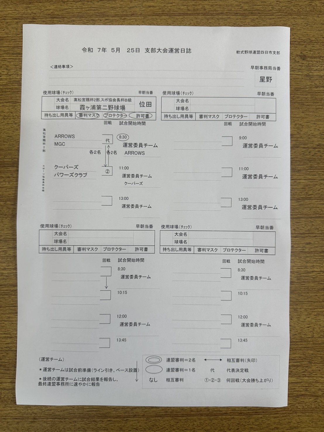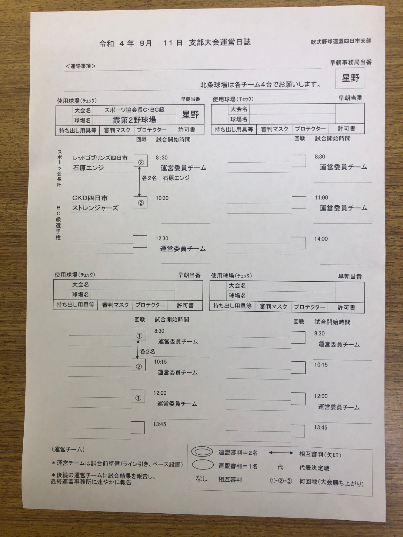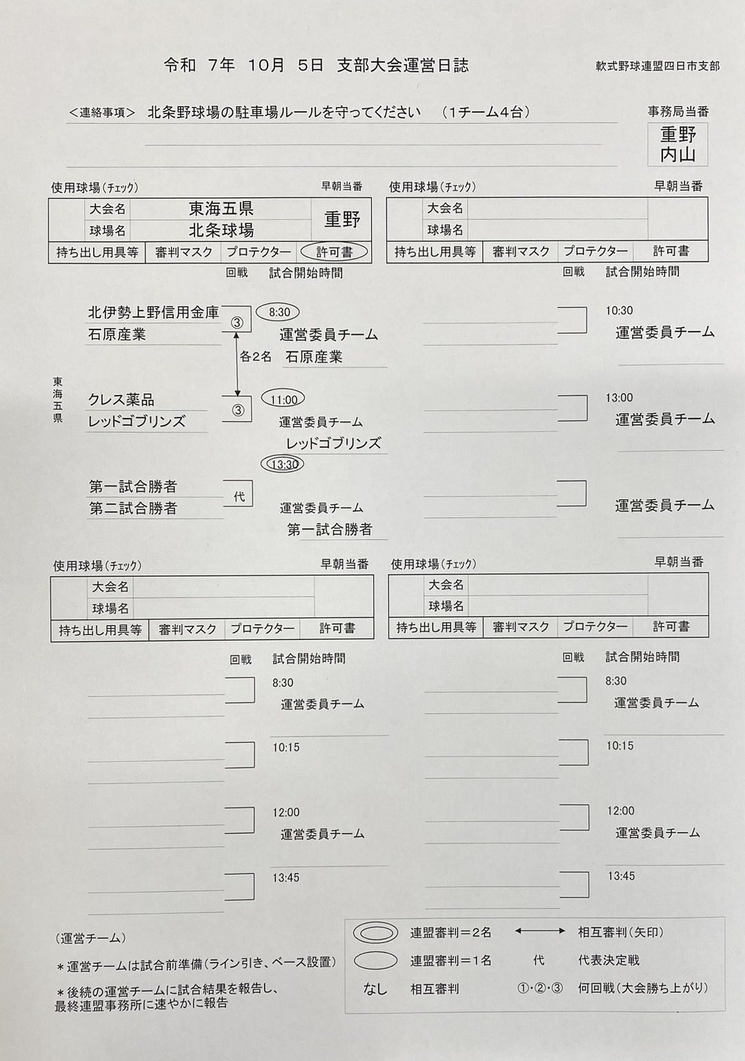 ■四日市市北条野球場□東海五県(2026年度分)第一試合 8:30 北伊勢上野信用金庫×石原産業第二試合 11:00 クレス薬品×レッドゴブリンズ第三試合 13:30 第一試合勝者×第二試合勝者支部運営日誌